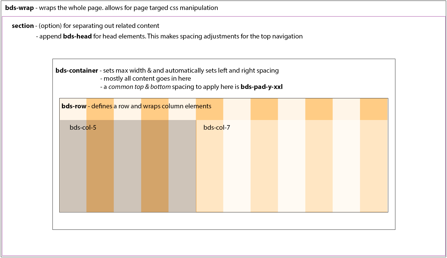 2. Class represention of tags: bds-h1 to bds-h6, bds-b1 to bds-b4, and bds-l1